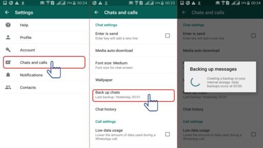 There is an option in whatsapp to back up data , also WhatsApp takes backing up daily conversion very easily , at 3 to 4 A.M. by default & the backup file save in your internal or external memory device, depend upon your memory settings or your handset configuration.
